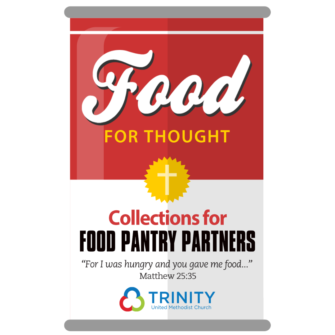 Food for Thought collects non-perishable food items in support of Trinity’s Food Pantry Partners at St. Paul UMC and New Market UMC. Donations can be dropped in Bins throughout the building at any time and are donated to partners monthly. No glass containers, please. Donate financially by noting FFT in your offering memo line. Volunteer opportunities include: delivering food to St. Paul’s every other month. Most needed items each month can be found HERE.