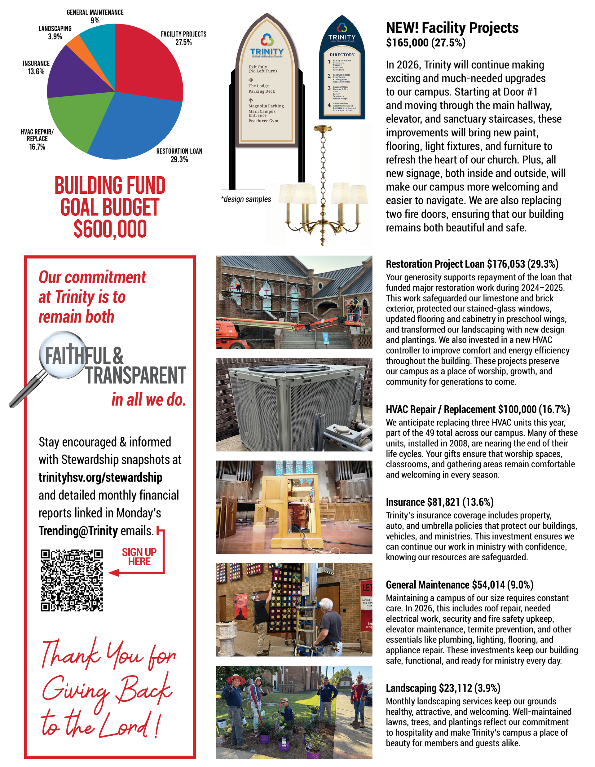 If you made a commitment to the Restoration Project Capital Campaign, please plan on including your 2026 restoration project gift with your 2026 Building Fund commitment. This will help ensure we can proactively pay down our Restoration Loan. Thank you for supporting Trinity's Building program to take care of the space where ministry happens.