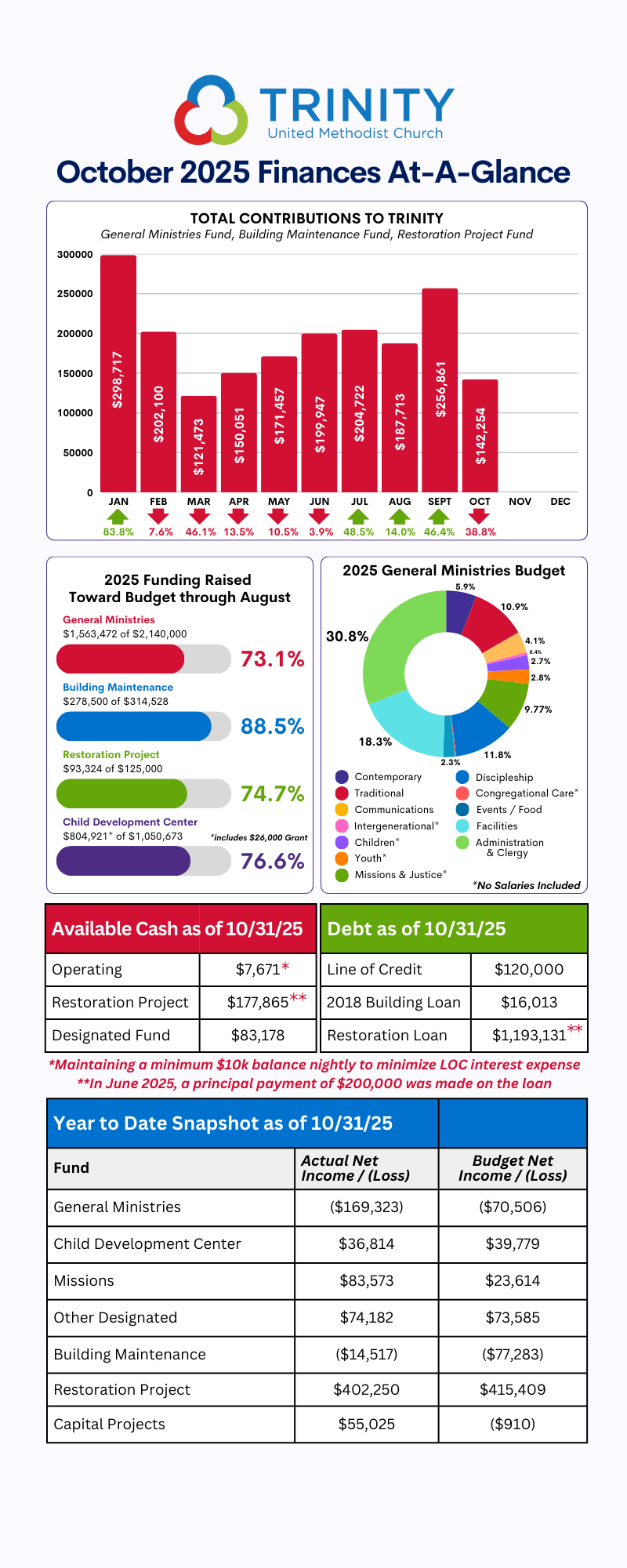 To access the most recent reports of Trinity's finances, bookmark this page and visit it at the end of each month, which is updated after the monthly Finance meeting. Look at the Finances-At-Glance charts (to the right of this section) which provides high level summaries of each fund relative to contributions and budget, available cash, line of credit, and net income/loss. Also, look for the Faithful and Transparent section (near the end) of the weekly Trending at Trinity email (comes out on Mondays) which has a link to the monthly reports. Subscribe to the weekly newsletter HERE.
